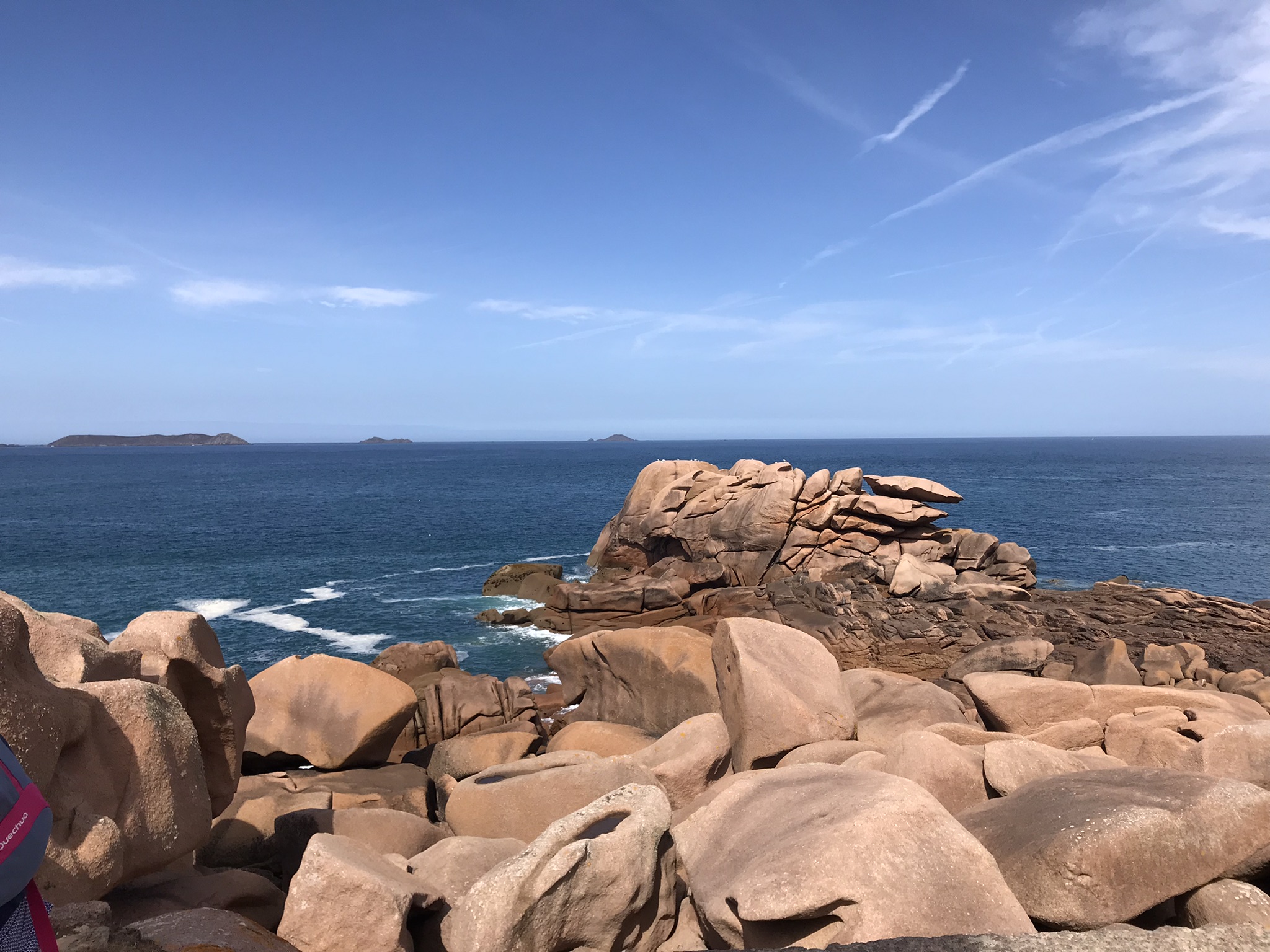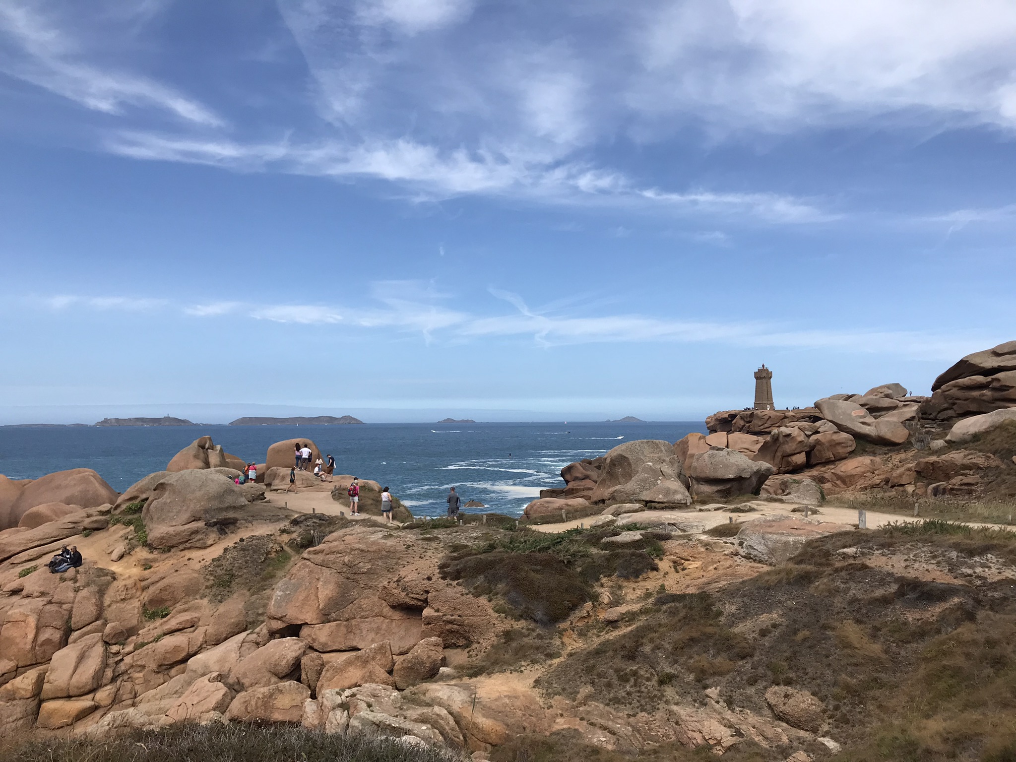 Toute la semaine j’ai guetté quel serait le plus beau jour en terme de temps, j’avais visé le samedi. Bien sûr le matin il faisait tout gris ! Tant pis, c’était le dernier jour de nos vacances, donc Go pour le fameux sentier des douaniers. On est partis de la plage de Trestraou, et ensuite il suffit de suivre le chemin :). Evidemment sans soleil les roches roses ressortent moins bien mais ça reste très beau.